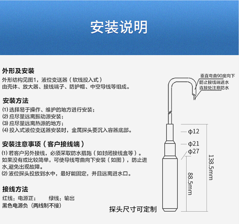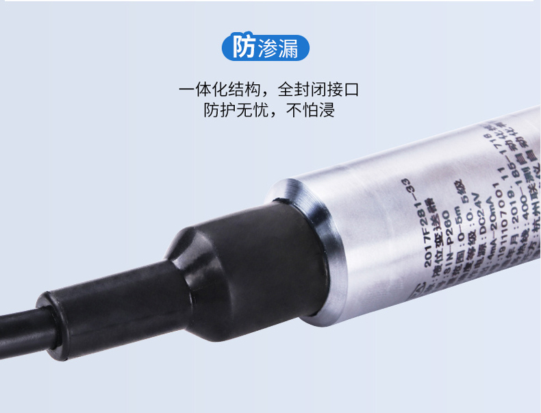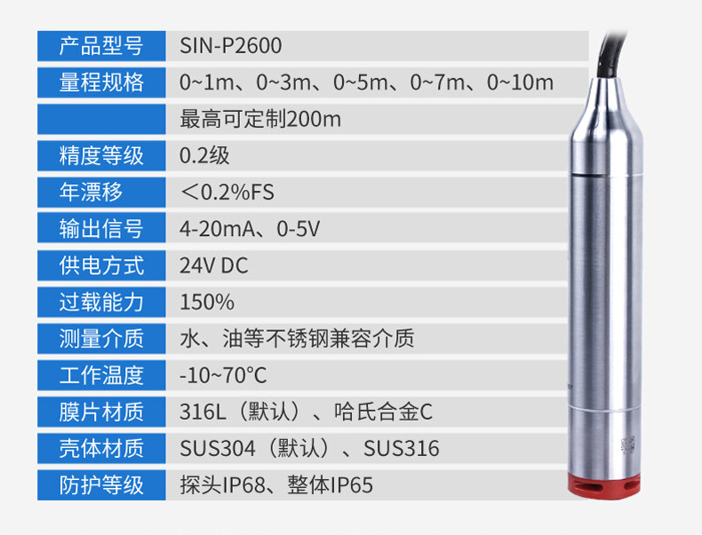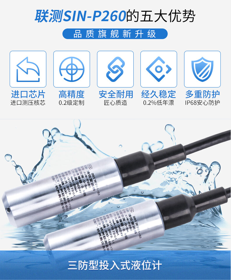 SIN-P260/P2600投入式液位變送器由高性能擴(kuò)散硅壓阻式壓力傳感器作為測(cè)量元件,把與液位深度成正比的液體靜壓力準(zhǔn)確測(cè)量出來(lái),并經(jīng)過(guò)信號(hào)調(diào)理電路轉(zhuǎn)換成標(biāo)準(zhǔn)(電流或電壓)信號(hào)輸出,建立起輸出信號(hào)與液體深度的線性對(duì)應(yīng)關(guān)系,實(shí)現(xiàn)對(duì)液體深度的測(cè)量。