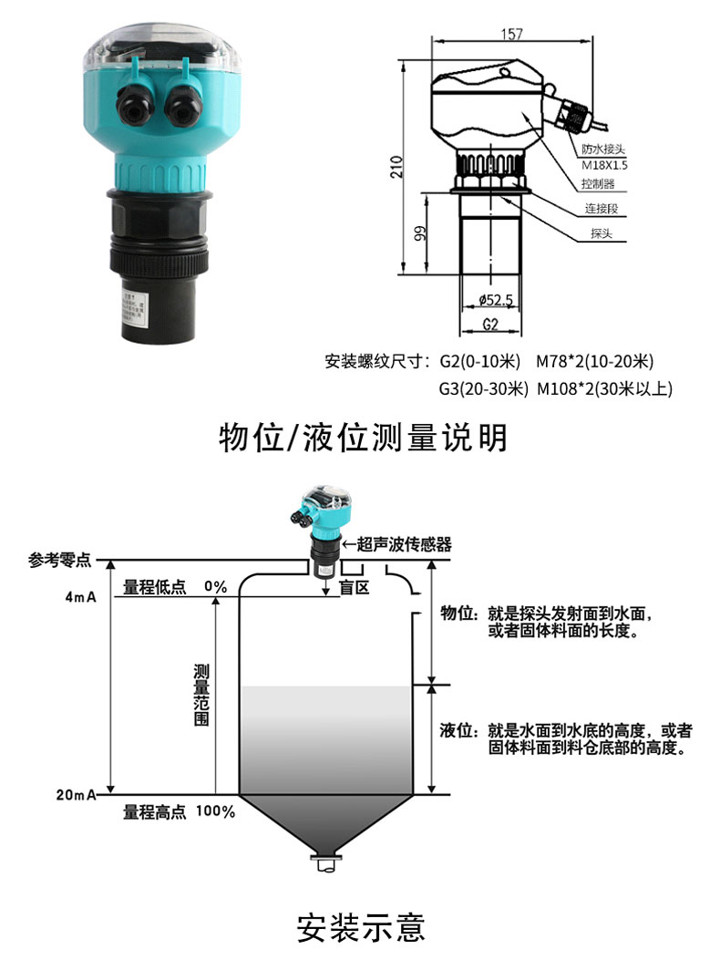 在測量中超聲波脈沖由傳感器(換能器)發(fā)出,聲波經(jīng)液體表面反射后被同一傳感器接收或超聲波接收器,通過壓電晶體或磁致伸縮器件轉(zhuǎn)換成電信號,并由聲波的發(fā)射和接收之間的時間來計算傳感器到被測液體表面的距離。 由于采用非接觸的測量,被測介質(zhì)幾乎不受限制,可廣泛用于各種液體和固體物料高度的測量。